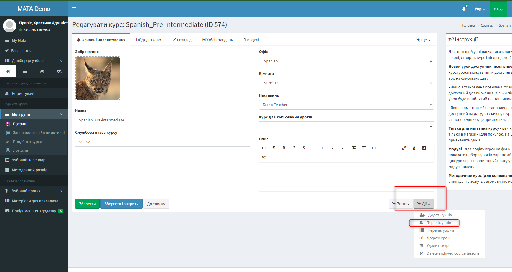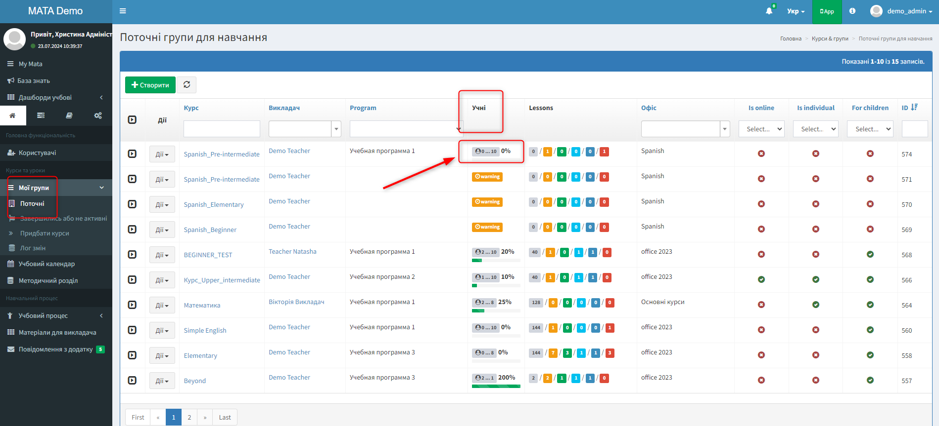 - В стовпці Учні перевірте перше число, так як це фактична кількість учнів на курсі на даний момент. Друге число—максимальна можлива кількість учнів на курсі.
